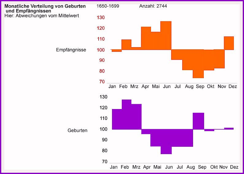 Die Abbildung basiert auf computerisiertem Kirchenbuchmaterial aus der Schwalm, einer Beckenlandschaft in der westhessischen Senke zwischen Marburg und Kassel (bestehend aus den elf Gemeinden Gungelshausen, Holzburg, Leimbach, Loshausen, Merzhausen, Ransbach, Wasenberg, Willingshausen, Zella, Christerode und Hauptschwenda).Im Zeitraum 1650-1699 hatten dort insgesamt 2744 Geburten stattgefunden. Diese Anzahl wurde hier auf 1200 reduziert. Hätte es in jedem der zwölf Monate gleiche viele Geburten gegeben, müsste das Resultat logischerweise überall 100 sein (unterschiedliche Monatslängen und Schaltjahre sind mitberücksichtigt und einheitlich auf je 30 Tage ausgeglichen). Dies ist jedoch nicht der Fall. Wie ersichtlich, kamen in den Monaten des Winterhalbjahres bedeutend mehr Kinder zur Welt als im Sommer. So entfielen auf die Januare 1650-1699 statt 100 Geburten 117, auf die Februare 126, auf die März-Monate 121, auf die Mai-Monate dagegen nur 82 und auf die sommerlichen Juni-Monate sogar nur 77 Geburten. Über den Zusammenhang zwischen dem Geburtsmonat und den Überlebenschancen Neugeborener vgl. Breschi 1994, zur saisonalen Verteilung der Konzeptionen Voth 1994. |