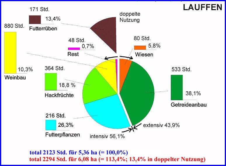 In den ortsspezifischen Abbildungen sehen wie die Bewirtschaftungsverhältnisse auf je einem "Durchschnittshof" einerseits in Lauffen und andererseits in Kleinaspach. Die Anbau-Areale sind vergleichbar. Zwar waren die Höfe am ersten Ort mit 5,36 Hektar im allgemeinen etwas kleiner als am zweiten mit 6,73 Hektar, doch wurden 0,72 Hektar für Zwischenfrucht (vor allem Futterrüben) doppelt genutzt, so dass ingesamt 6,08 Hektar zu bearbeiten waren. Dennoch ergaben zeitgenössische Interviews, dass eine Bäuerin in Lauffen zu Beginn der 1910er Jahre durchschnittlich 2294 Stunden Feldarbeit zu leisten hatte, während in Kleinaspach "nur" 1637 Stunden (vgl. hierzu die hervorragende Arbeit von Bidlingmaier 1918/1993).